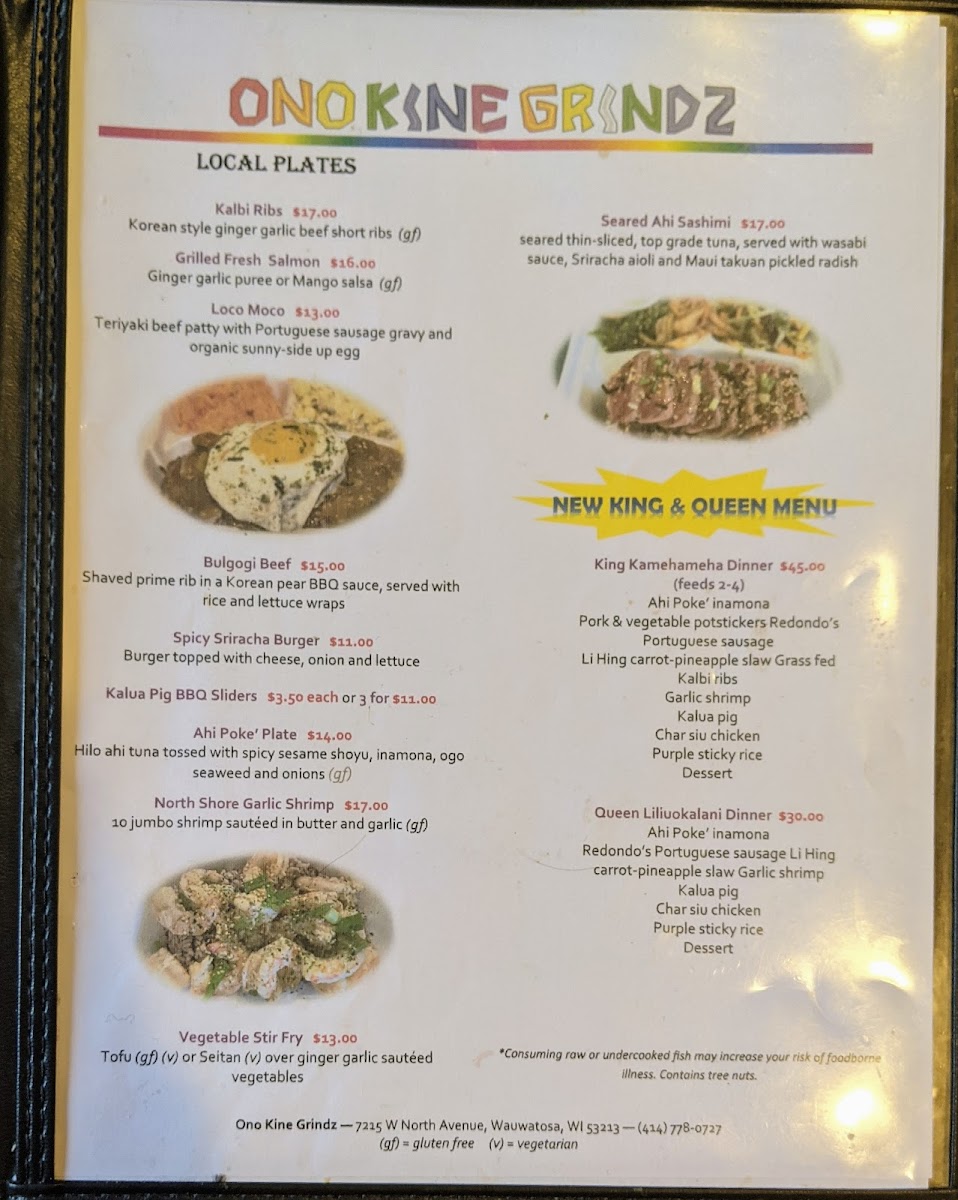 Welcome to Ono Kine Grindz, where authentic Hawaiian cuisine meets a cozy, welcoming atmosphere. Located in Wauwatosa, this gem captures the essence of the islands with a menu that celebrates traditional flavors. From the Special Teriyaki Chicken at $18.00 to the luscious Kalua Pig at $18.25, each dish is crafted with passion and quality ingredients, sourced fresh from Hawaii.